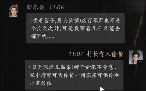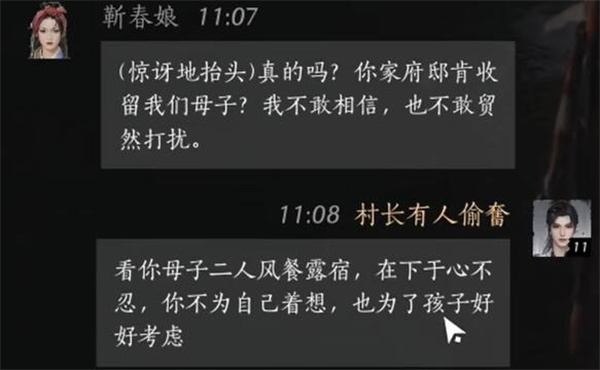 玩家:看你母子二人风餐露宿,在下于心不忍,你不为自己着想,也为了孩子好好考虑。