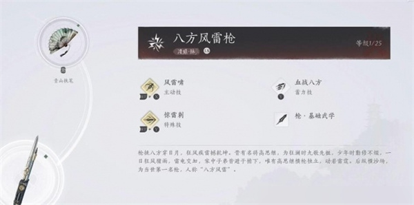 1、在游戏中,八方风雷枪是狂澜门派的武学技能之一。