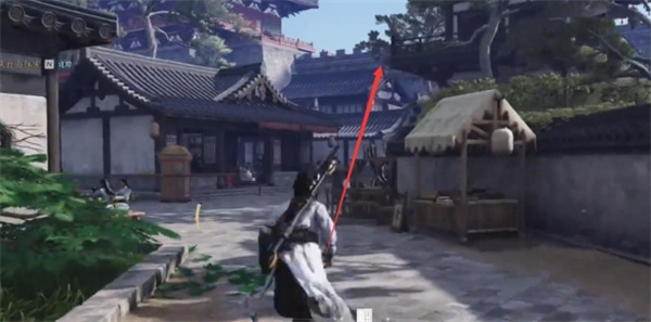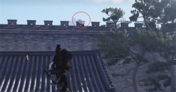 2、然后往前面的城墙方向走,在城墙上找到伞;