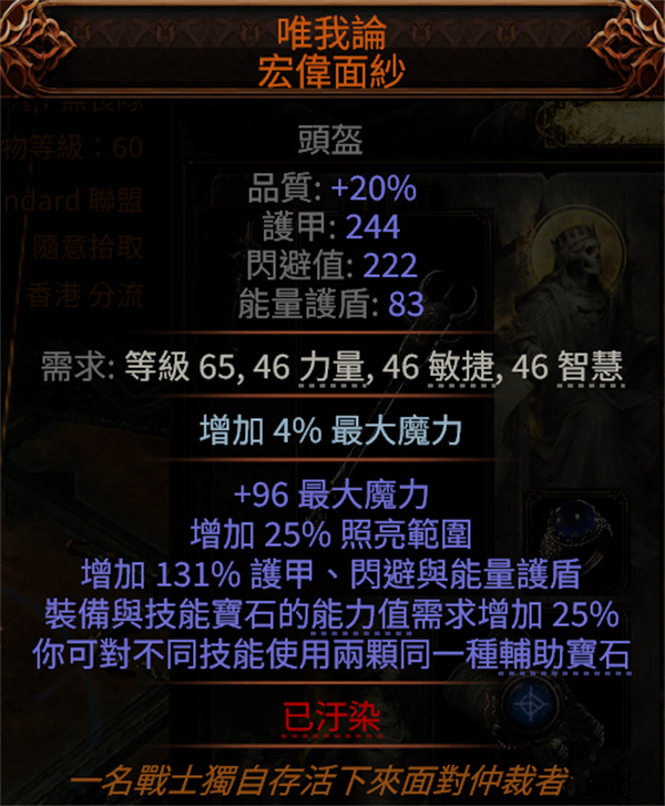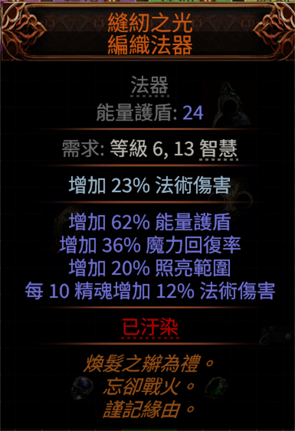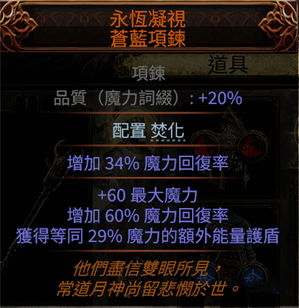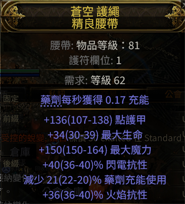 高配:好一点的底子,150+魔力,20%生命药剂回复速度,3条30%单抗性/20力量/晕眩门槛/药剂减耗