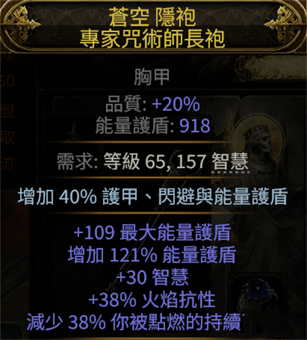 顶配:裂隙基底,前缀150+魔力和20%冰冷伤害,后缀3条30%单抗性/10%全抗/20力量/敏捷/智慧/10全属性