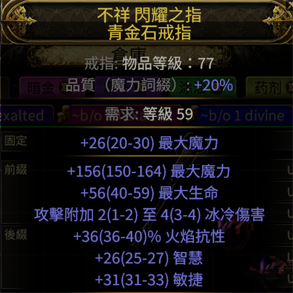 高配:基底最好是抗性基底,150+魔力,3条30%单抗性/10%全抗/20力量/敏捷/智慧/10全属性