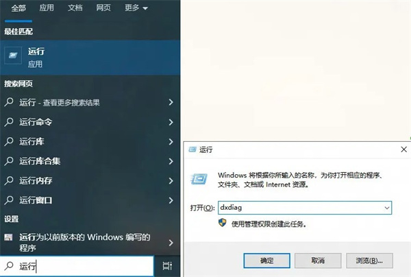1.搜索窗口输入运行或者按住Win键+R键打开运行窗口,输入dxdiag后点击确认。