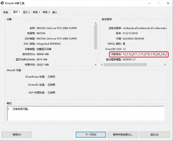 2.打开后等待诊断工具运行完毕,点击显示页,功能级别这里有12则支持DirectX 12,没有则不支持,建议使用DirectX11启动游戏。