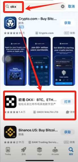 我们购买登录完成之后,我们直接搜索“OKX”,搜索出来之后,我们不要看第一个,要看到第二个。第二个才是正版的欧易OKX。然后大家下载安装就可以了。