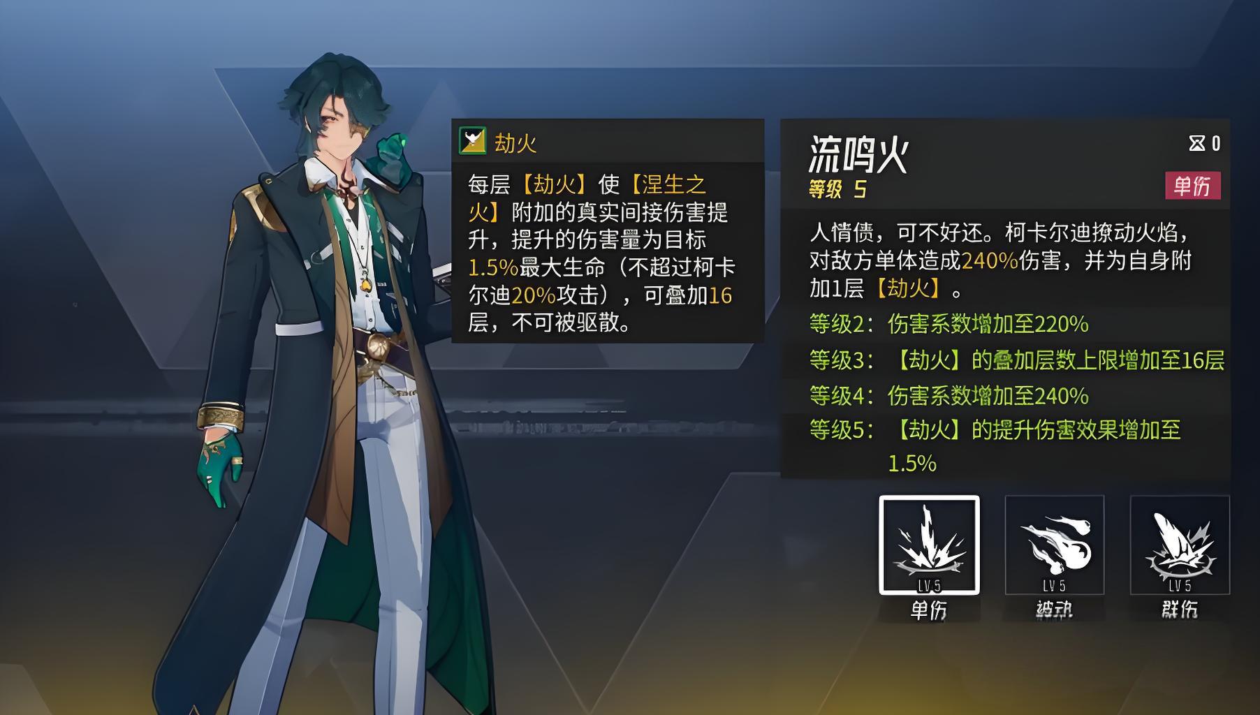 1、普通攻击流鸣火对单个目标释放火焰伤害,造成240%攻击力输出,同时为自身叠加一层劫火状态,该状态是核心机制的关键组成部分。