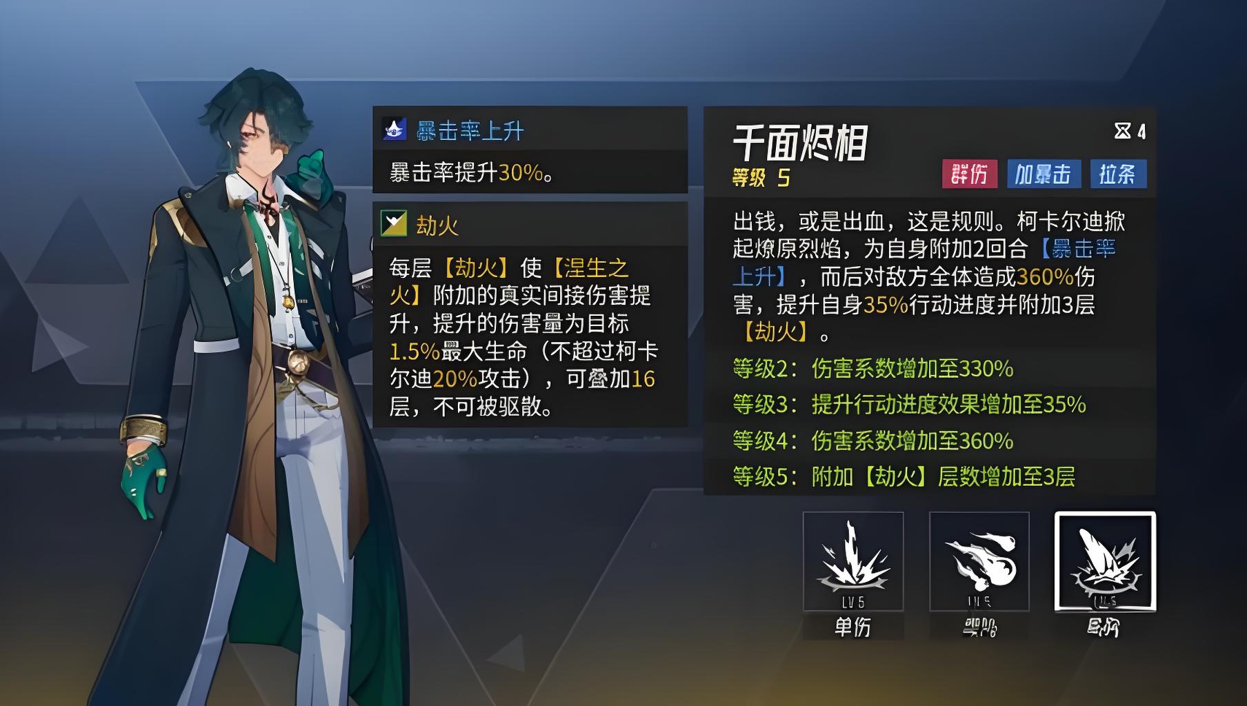 4、终极技能千面烬相对全体敌人造成360%群体伤害,接下来两个回合提升自身暴击率,行动进度条推进35%,额外获得三层劫火增强连续作战能力。