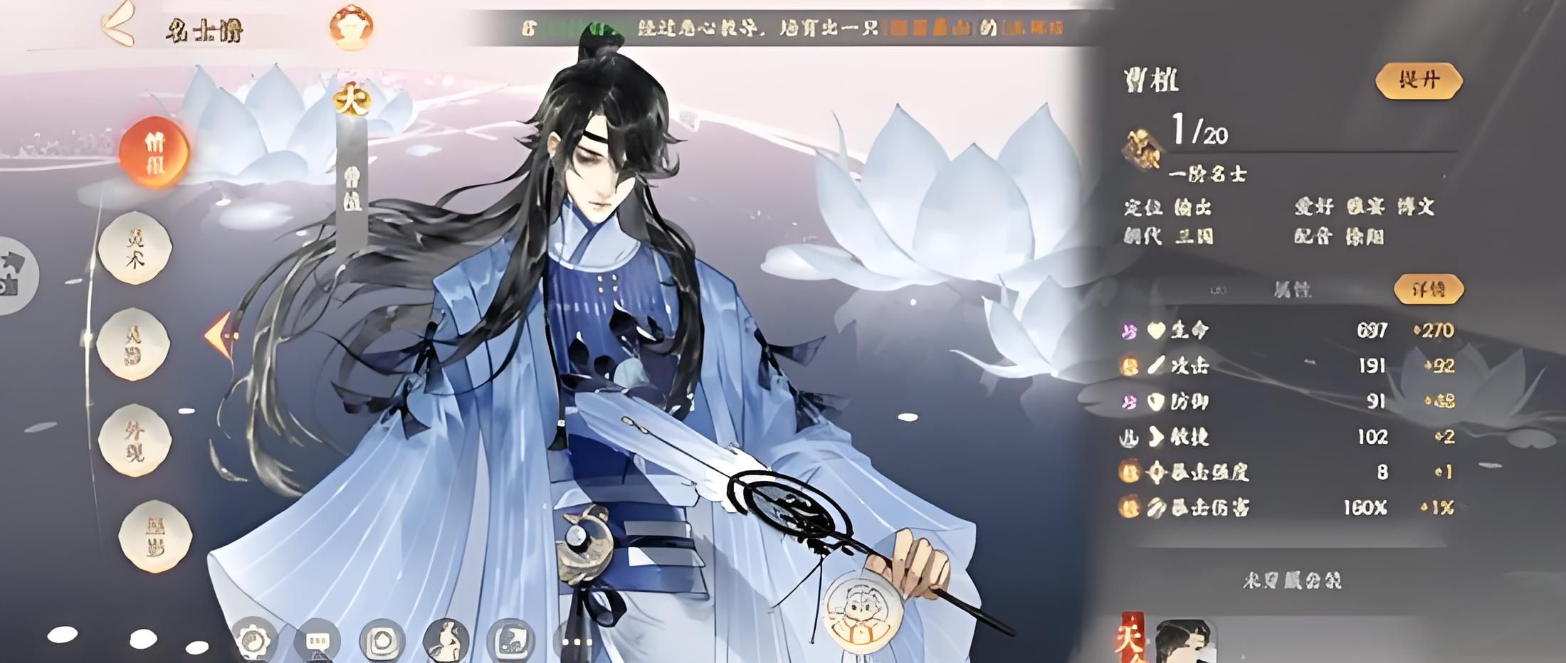 忘川风华录曹植是定位输出的老牌追击队核心名士,技能机制围绕七步和追击展开,兼具稳定输出与自回血能力,培养需侧重暴击相关属性堆叠。很多玩家对其技能触发条件、猫灵选择及灵器搭配方向存在疑问,本文会详细梳理核心玩法与完整培养方案,帮助大家充分发挥其追击输出优势。