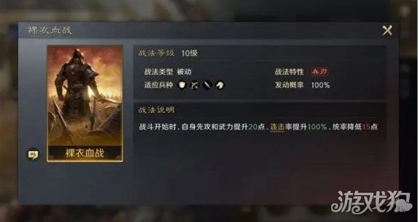 战斗开始时,自身先攻和武力提升20点,连击率提升100%,统率降低15点。
