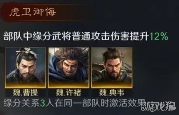 虎卫御侮:部队中缘分武将普通攻击伤害提升12%。