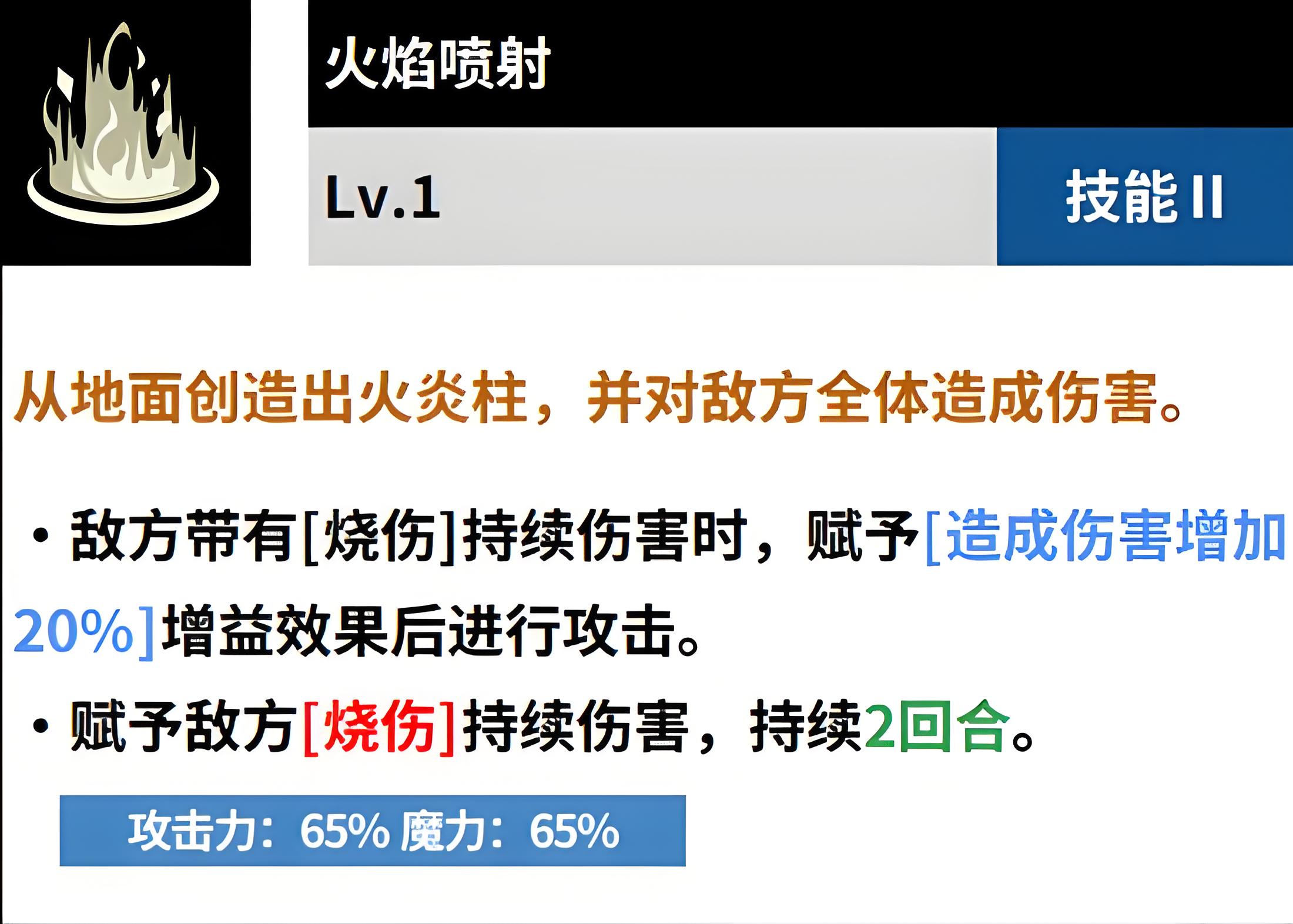 2、群体技能火焰喷射召唤火焰柱打击全体敌人,敌方带烧伤时额外增二十伤害并延续状态,单次伤害虽低但清场与叠加状态效果突出。