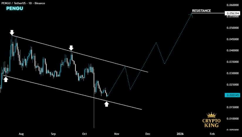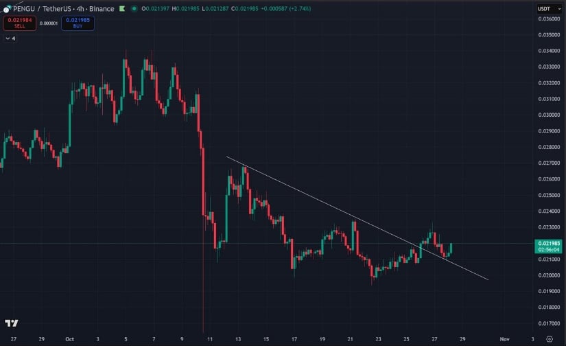 PENGU代币开始挑战下降趋势线,暗示看跌压力消退及潜在的早期看涨反转。来源:RGF via X