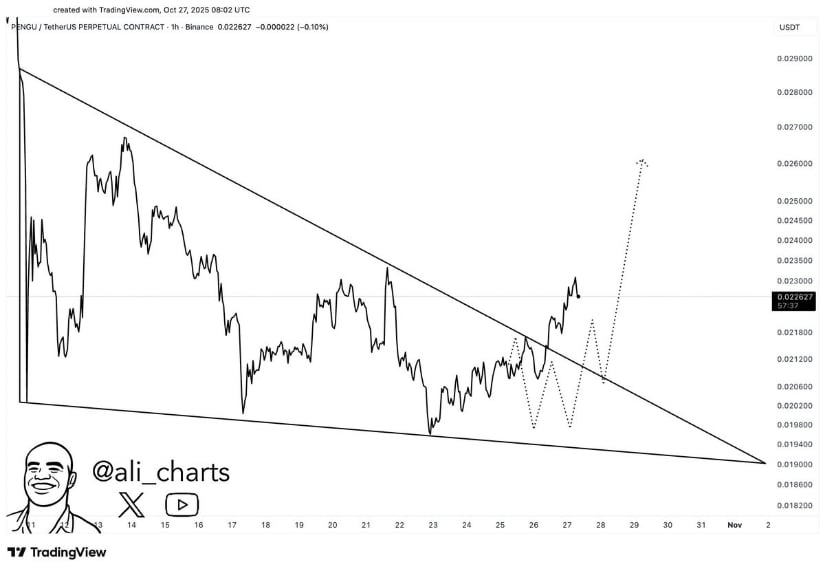 PENGU确认突破下降楔形,若量能持续有望实现20-25%涨幅至0.026美元。来源:Ali Martinez via X