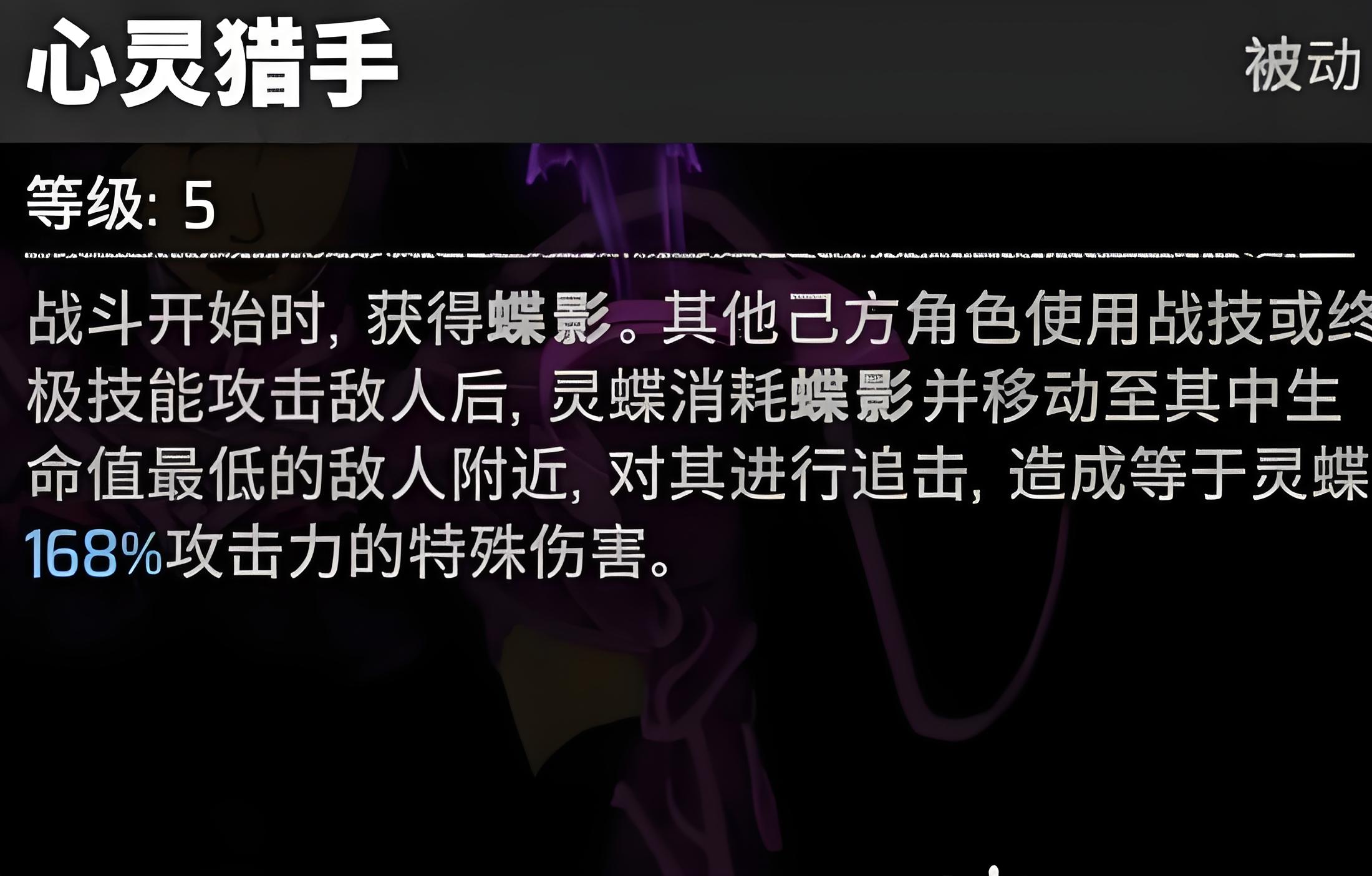 1、被动心灵猎手让灵蝶优先锁定生命值最低敌人攻击,PVE中高效补刀快速削减敌方单位数量,团战后期收割残血能力突出。