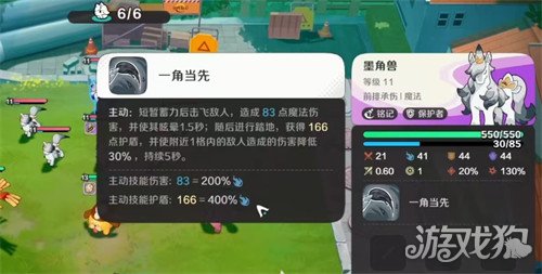 此时的话还会对这位敌人带来后续的1.5秒眩晕控制,控制达成之后,墨角兽还会进行一个踏地的动作,这个踏地动作是给他自身带来一个护盾,这个护盾保护他自身的同时,还可以给友军带来足够的保护能力,此时的保护能力并不是覆盖到全体队友身上的,而是使墨角兽周围一格以内的敌人都会得到伤害降低的效果,所以如果大家想要整体保护流的数值达到最高的话,其他的角色最好都要挨着墨角兽的定位来站,隔得太远的话,这个这技能就不生效了。
