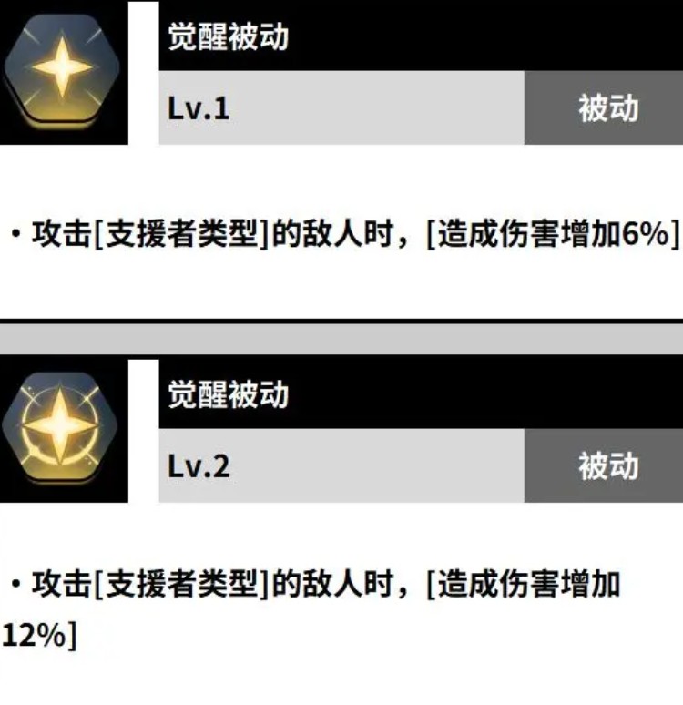 觉醒被动技能主要是戈登去攻击支援者类型的敌人时会被触发,触发后能够给敌人造成的伤害再增加6%,觉醒被动技能在升级到2级后,在去对支援型的敌人进行攻击时,所造成的伤害会增加12%。