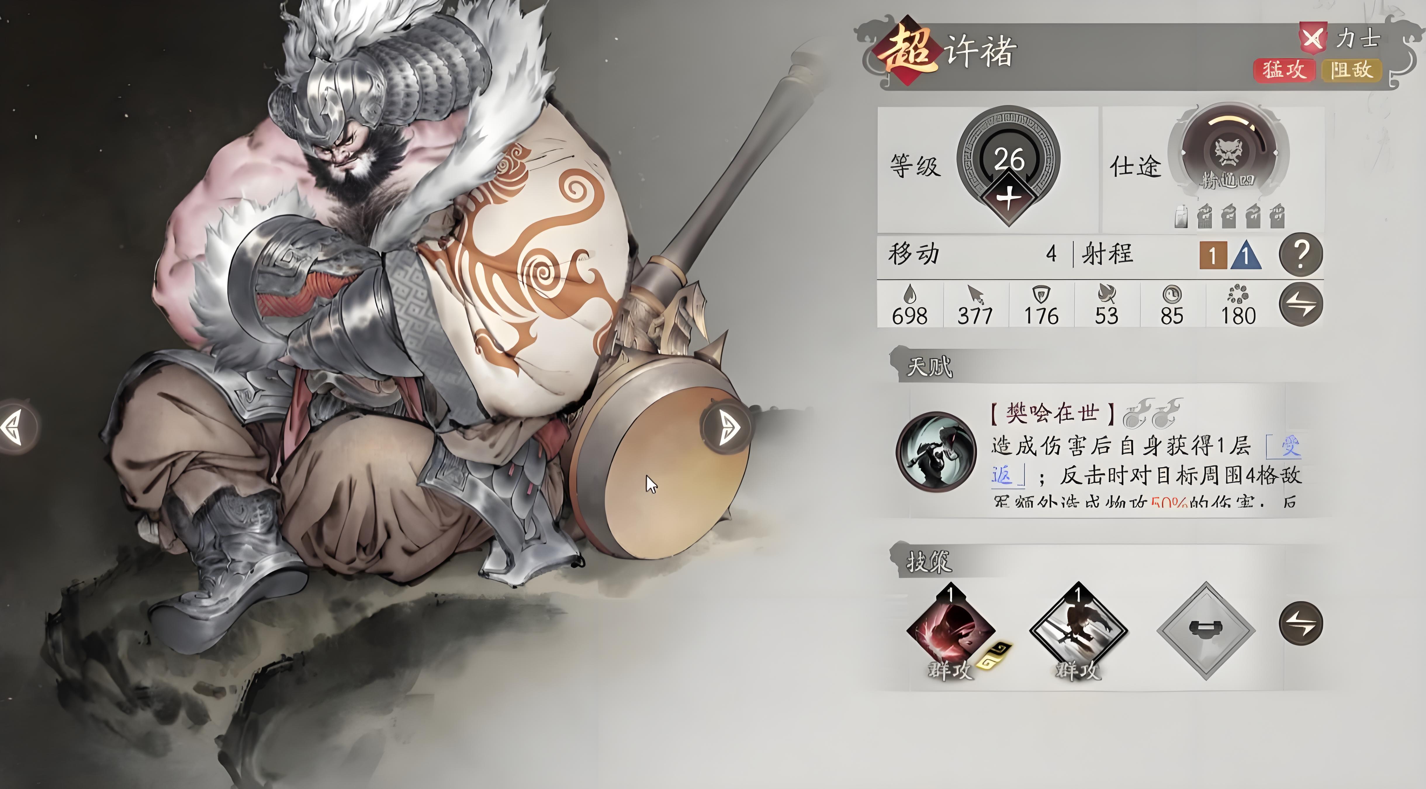 1、许褚定位反击流派战士拥有群体反击能力,战场中充当肉坦站在前排吸引大量敌人火力,凭借自身强悍特性难以被击倒,生存输出兼顾。