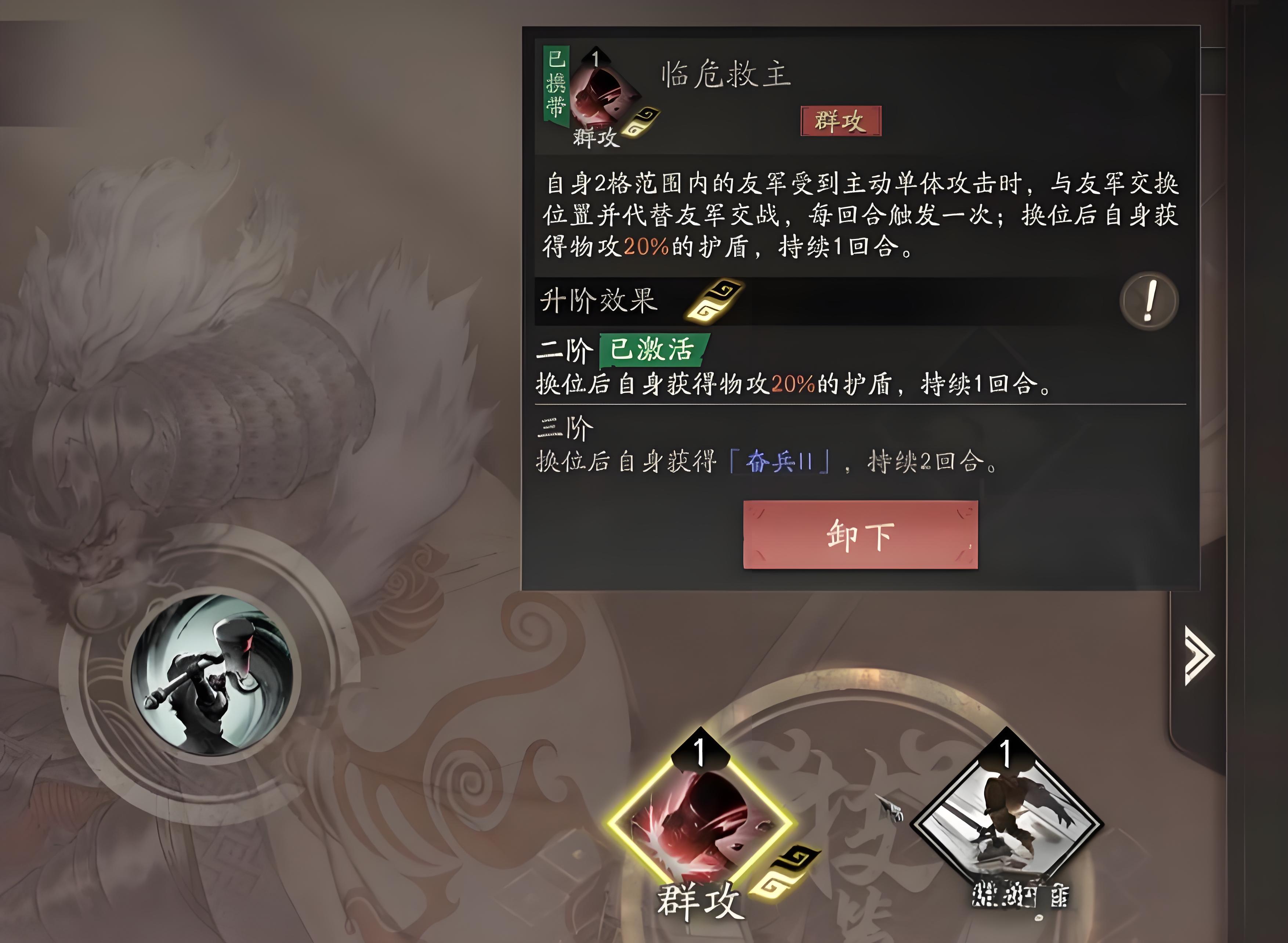4、临危救主可援护队友交换位置并代为承受攻击,二阶后解锁护盾,关键时刻保护输出角色,同时自身吸收更多伤害实现攻防一体。