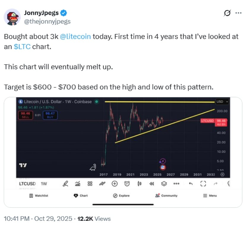 某投资者时隔四年以3000美元重仓莱特币,预期价格将突破600-700美元区间。来源:@thejonnyjpegs via X