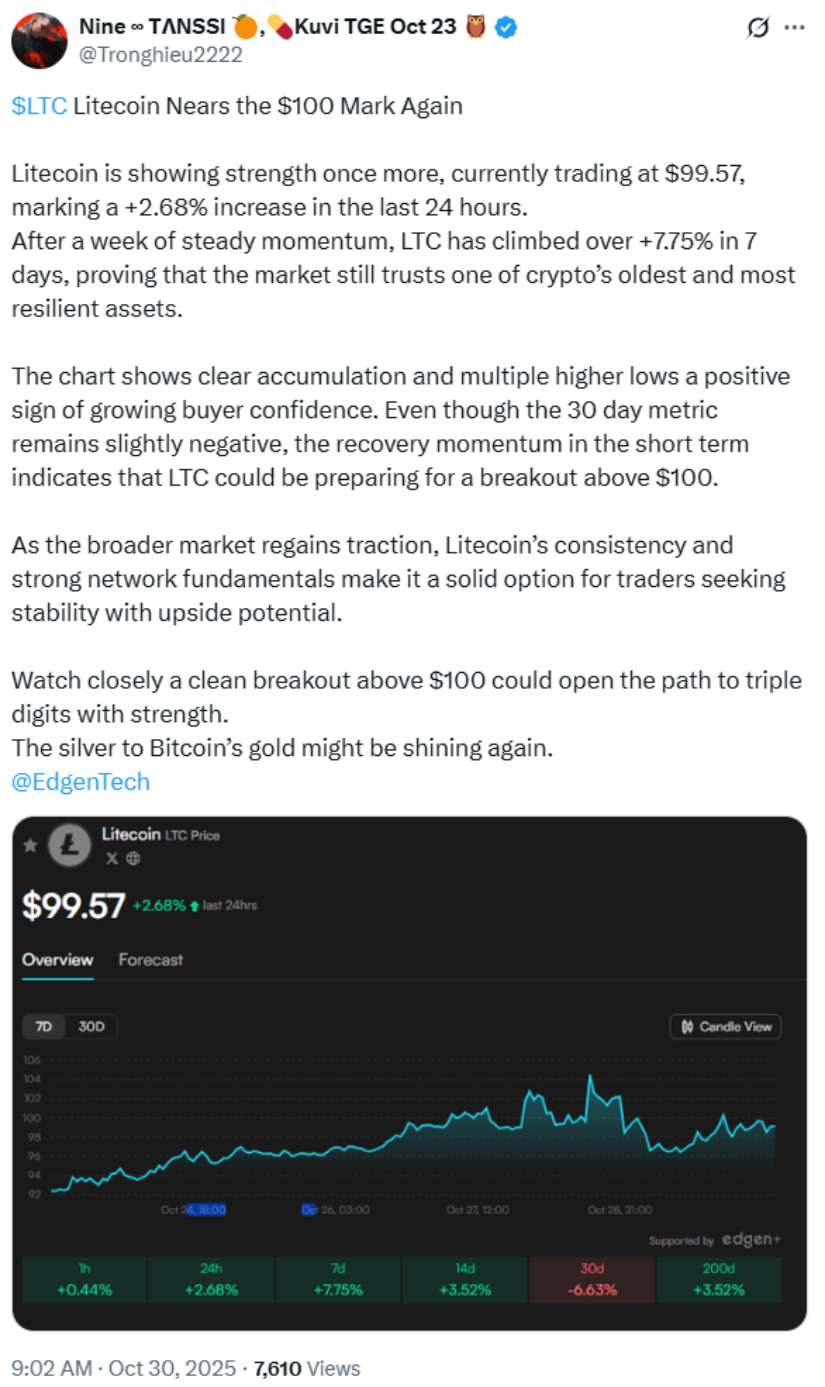 莱特币重拾上涨动能,现价逼近100美元关口,周线稳步收涨且积累信号强烈,预示市场信心恢复可能推动突破行情。来源:@Tronghieu2222 via X