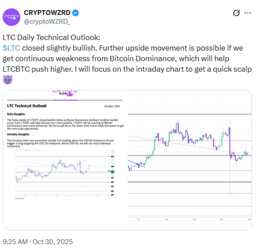 莱特币小幅收涨,若比特币统治力继续减弱则存在进一步上行空间,交易员正密切关注日内图表寻找短线机会。来源:@cryptoWZRD_ via X