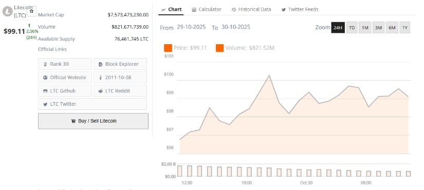 莱特币现报99.11美元,24小时涨幅2.56%。来源:Brave New Coin