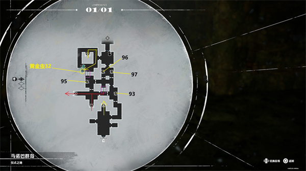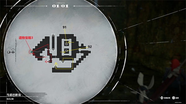 回到地下1层,继续按照红线,最西侧的遗物宝箱3,里面是青苔覆盖的圆柱。继续跟着红线走,下楼梯去地下2层。