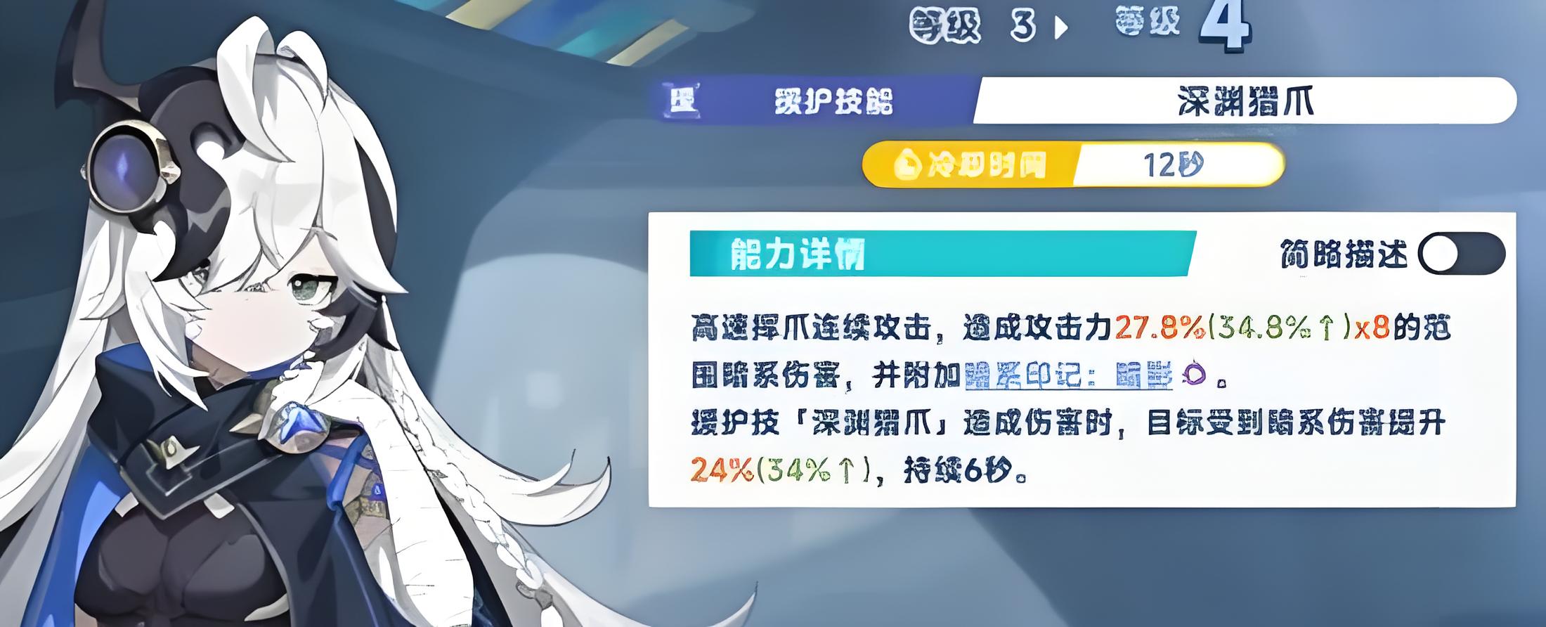 2、深渊猎爪是关键技能,攻击时造基础伤害,附加暗属性易伤,还能触发残影印记,最多叠三层,每层提4点6%攻击,叠满达12%。