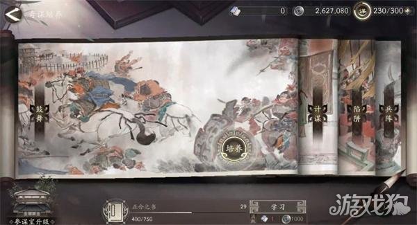 参谋是是研习奇谋的重要场所,他结合了鼓舞、计谋、陷阱、兵阵这四大类奇谋,玩家在战斗过程当中离不开这四部分,在这里可对这四部分的启蒙进行快速培养和学习,不过每一次的学习都会消耗一本奇书和1000个银币,目前游戏当中的奇谋包括上百个,从哗变之策到伏兵之策,再到一鼓作气、猛火计,玩家都可一一进行学习。