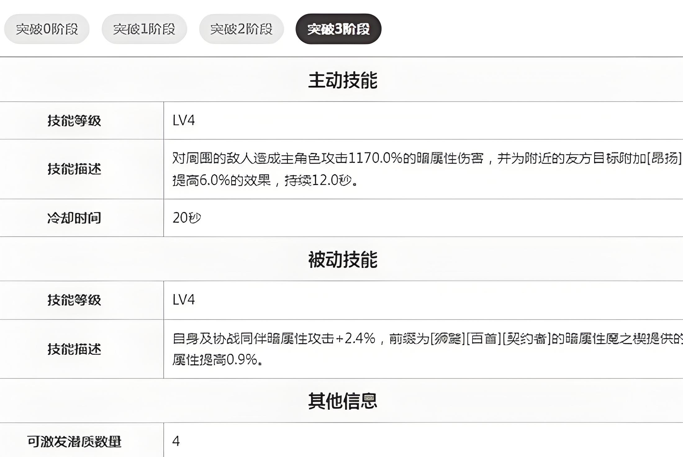 5、养成潜力高突破零阶段即能发挥作用,突破三阶段技能效果更稳,4个潜质激发位支持个性化发展方向调整。