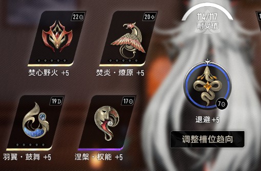当然还有一些备选的词条,例如焚心野火可以进一步的提升火属性的伤害,虽然说角色的输出能力并不算主力。但多一点伤害,那在打败小怪时也会更快面对一些血厚的小怪时,效果还是很明显的。羽翼鼓舞这也是可以选择的一个在增加技能耐久之后还可以叠加专属武器的效果,可以让灼热地狱的持续时间继续的延长,不需要去频繁的开技能捕捉伤。最后推荐一个必退,主要是为了让核心词条拥有比较稳定的属性触发,避免冲突而导致失效。