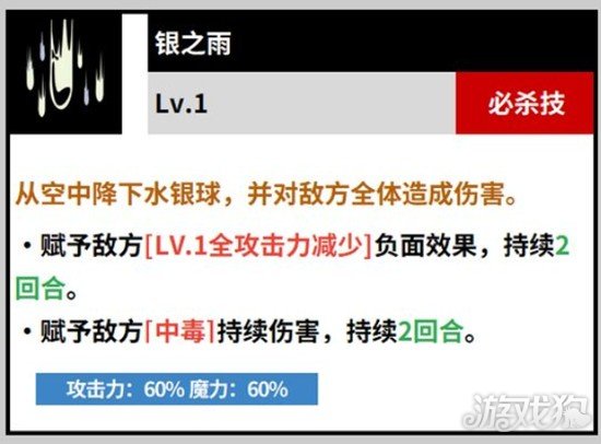 诺杰尔的一技能名为银之弹,是其主要的起手技能之一。该技能可对单体敌人造成远程伤害,并有一定概率附加中毒状态。中毒效果可持续两个回合,期间目标每回合都会受到持续伤害,同时攻击力会逐步下降。由于该技能冷却时间较短且使用频率高,常被用于战斗初期为敌方施加负面状态,为后续技能衔接创造条件。在黑色四叶草魔法帝之道的对战节奏中,银之弹是触发连环控制的关键起点。