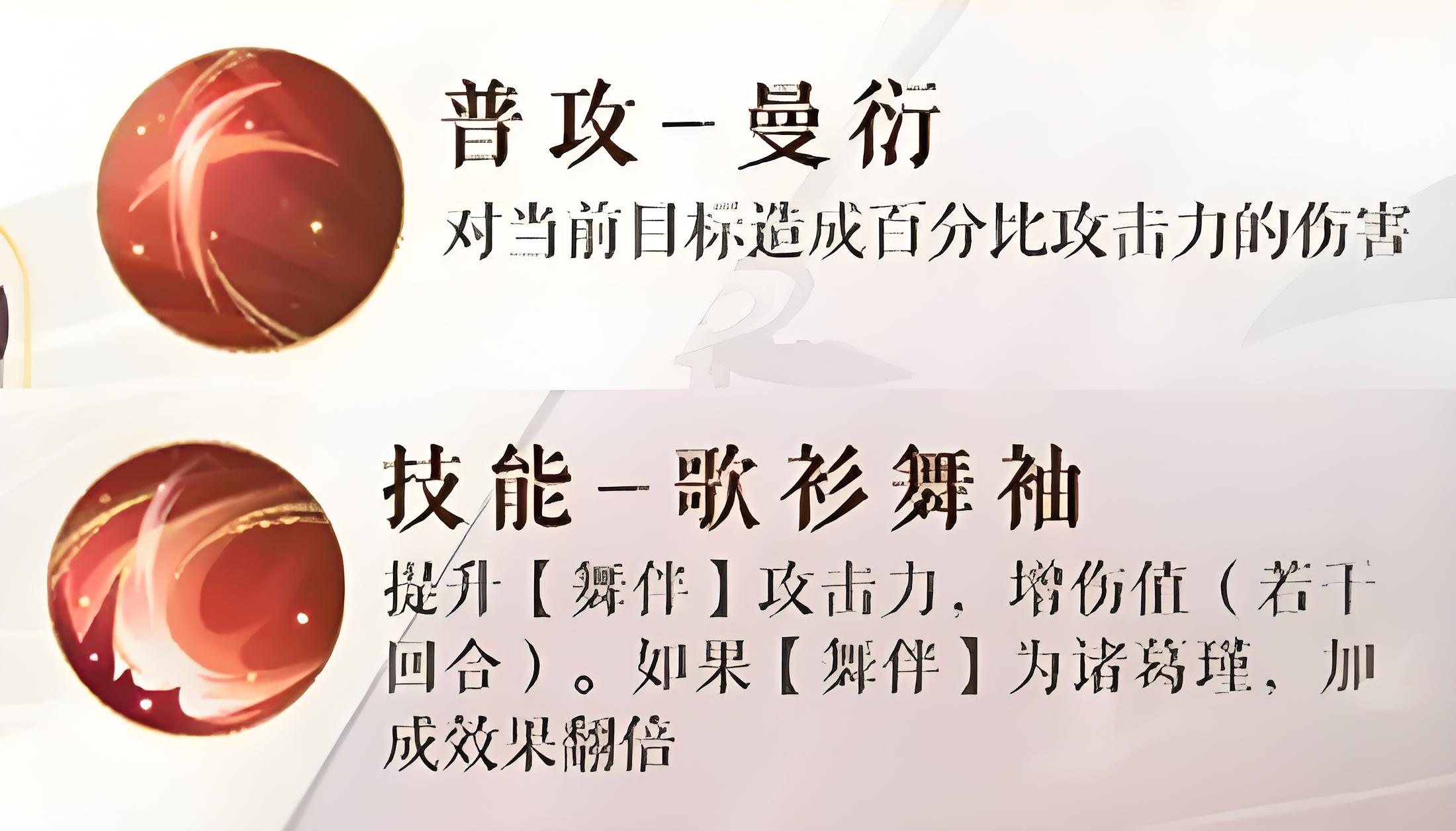 2、核心辅助歌衫舞袖提升舞伴攻击力并加额外伤害,效果持续多回合,稳定强化队友输出能力。