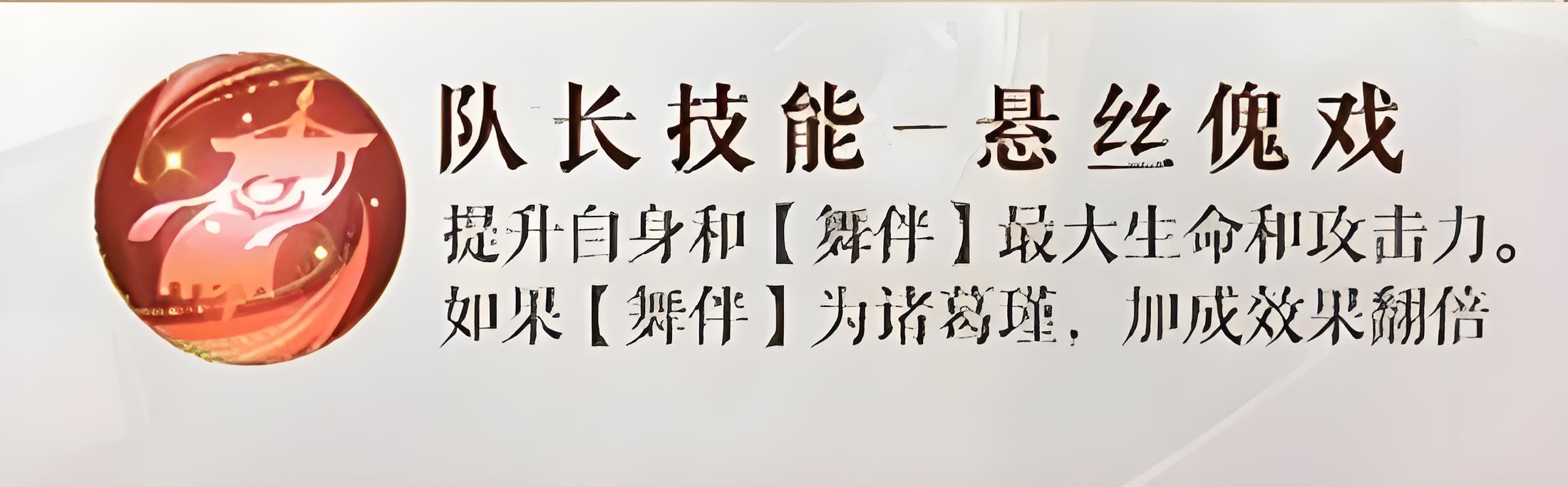 3、队长技能悬丝傀戏提升自身与舞伴最大生命和攻击力,舞伴为诸葛瑾时加成翻倍,团队收益更高。