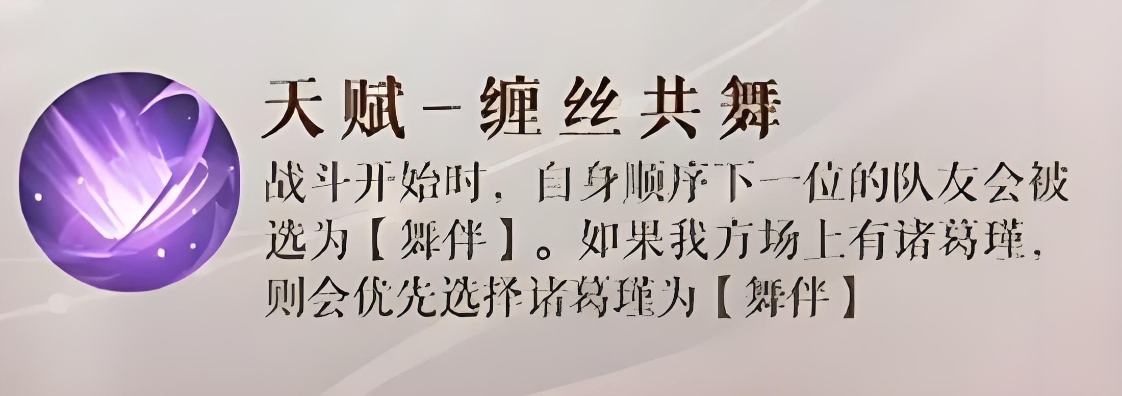 4、天赋缠丝共舞战斗开始瞬间,依据场上队友排列顺序自动选一位为专属舞伴,无需手动操作。