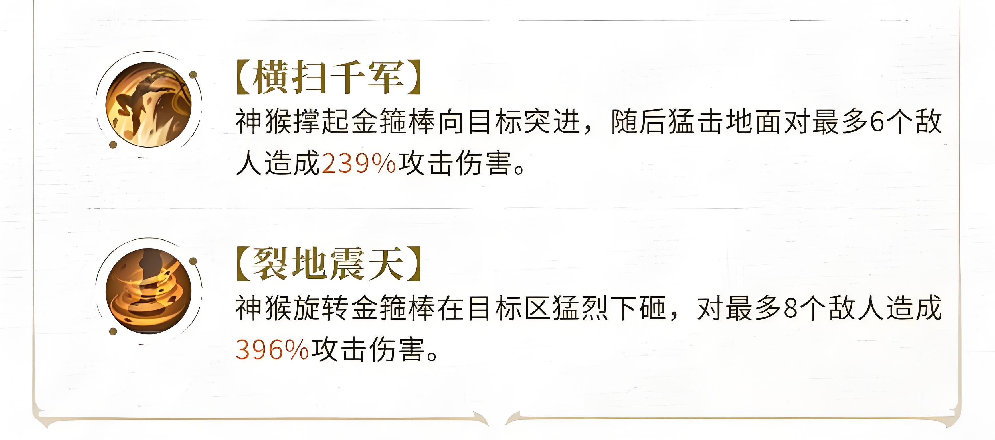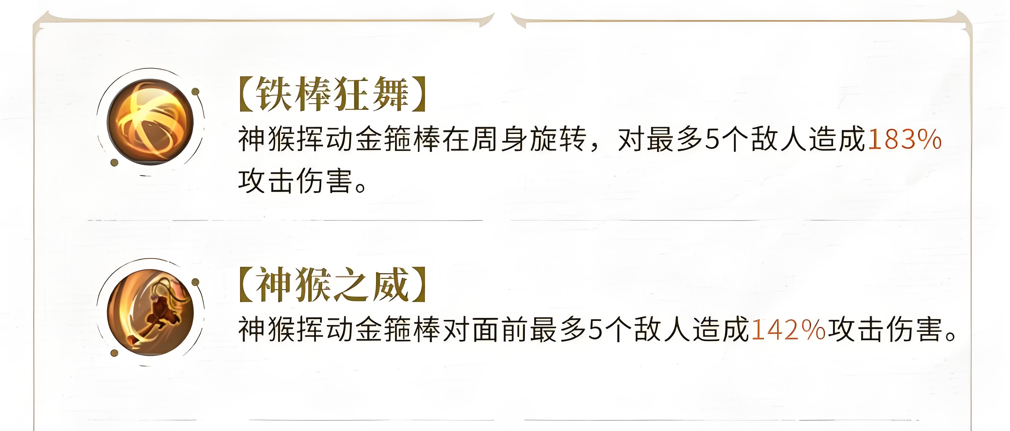 3、技能神猴之威向面前挥动金箍棒,针对最多5个敌人造成142%攻击伤害,适合正面迎击推进的敌方群体单位。
