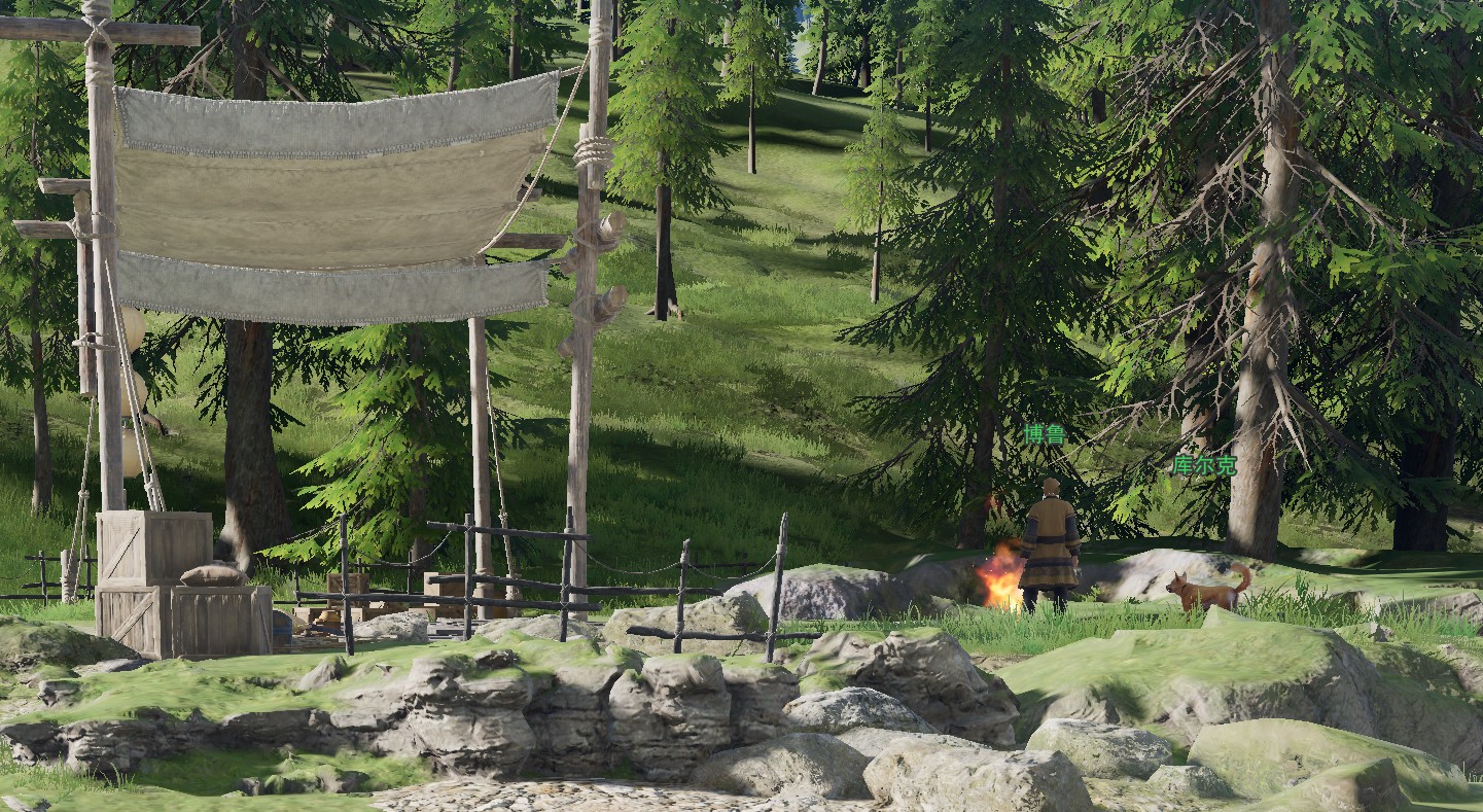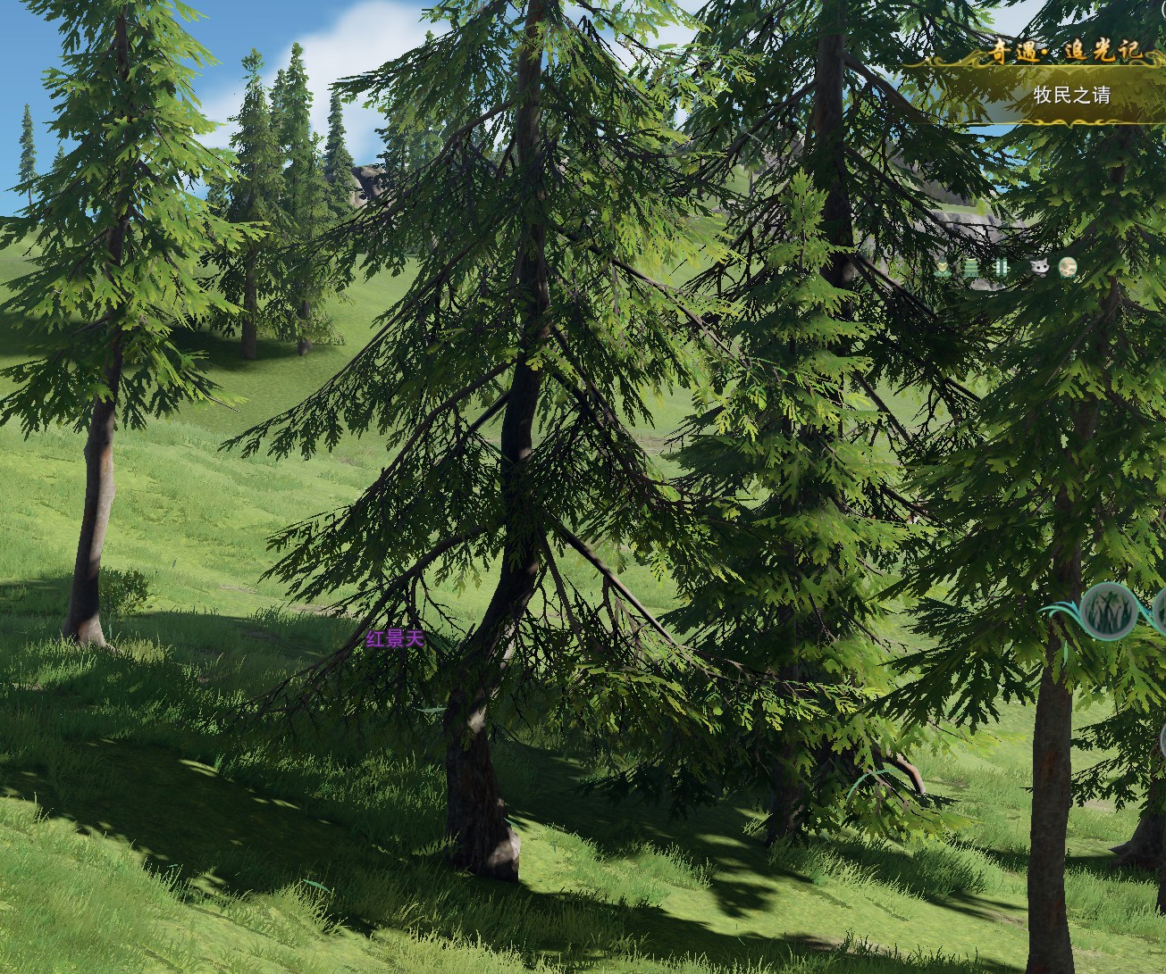 3、对话后【博鲁】同意借猎犬但要帮他找红景天,红景天在神行点上方的一个射箭游戏附近,几颗松树围着。