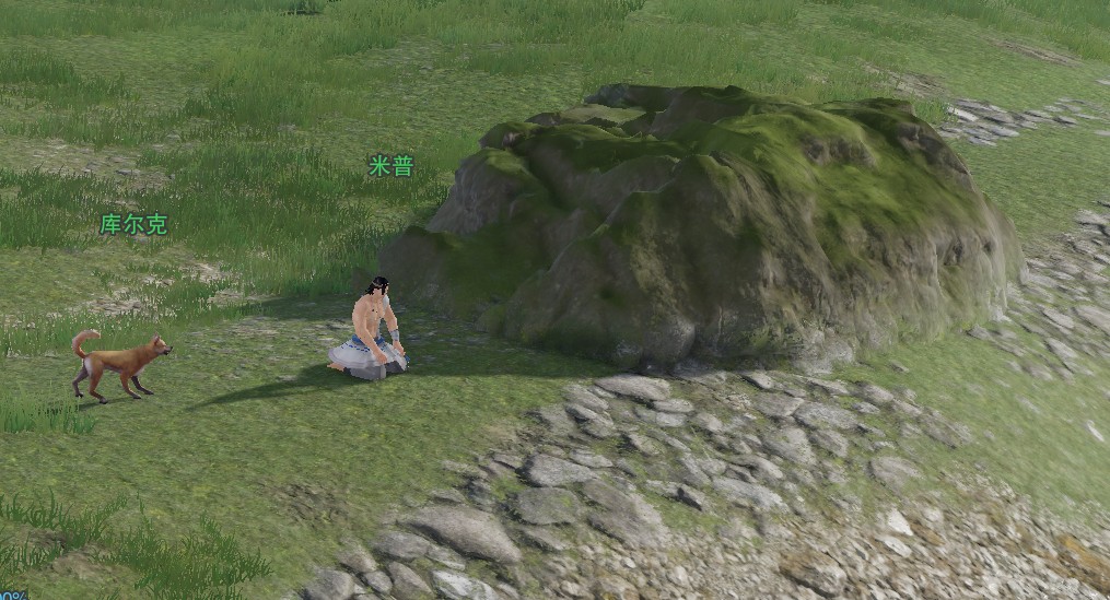 4、采完红景天,回去对话【博鲁】,右上角变成【借得猎犬】再回去刚刚的神行点附近找【米护】,对话猎犬【库尔克】,跟随到消失闪烁提示就在前面,大轻功往前飞一段在河道边的石头侧找到【米普】。