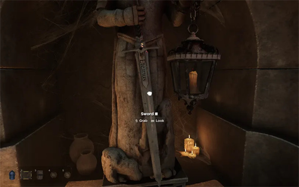 检查地上的箱子。箱子上有带有倒置剑、头盔和盾牌图像的滑块。环顾房间,你会发现这三个物品上都标有“Eternus”字样。