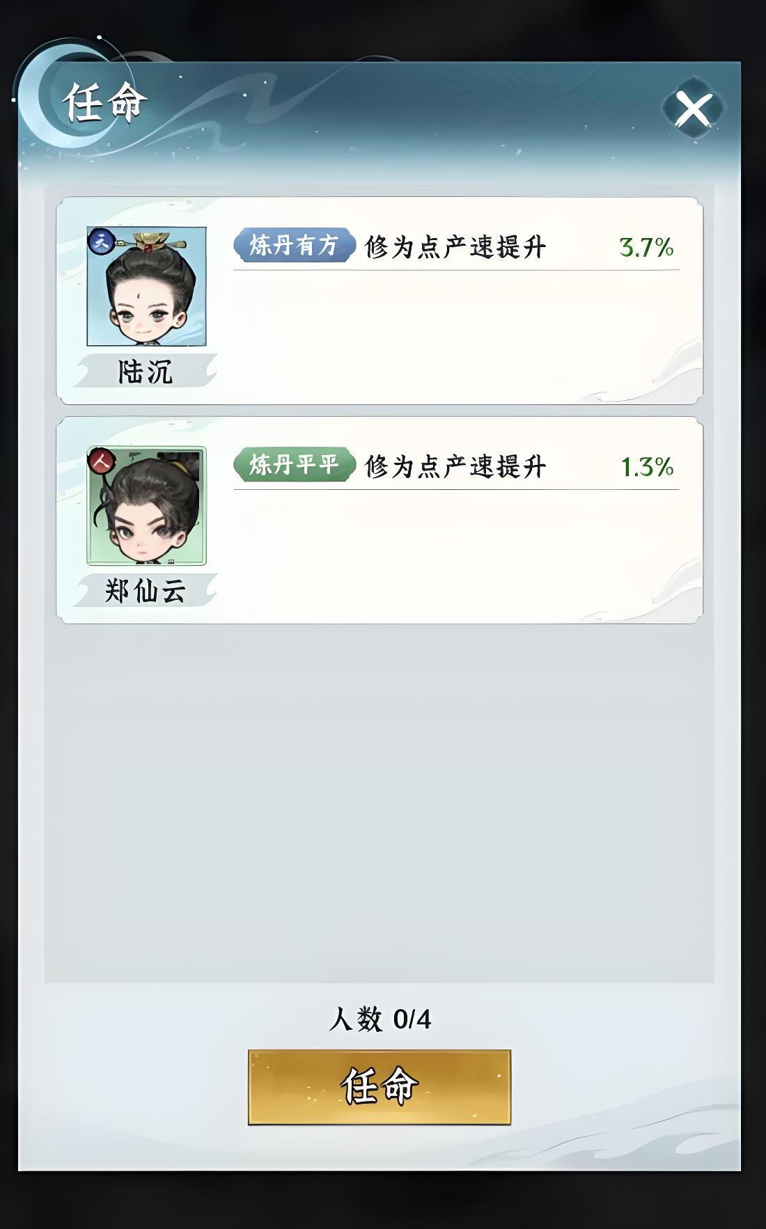 5、通过纳新主动招揽,修建神游阁后消耗天缘符探测周边修仙奇才,感应到优质目标后前往邀请,双渠道结合保障弟子队伍质量与数量。