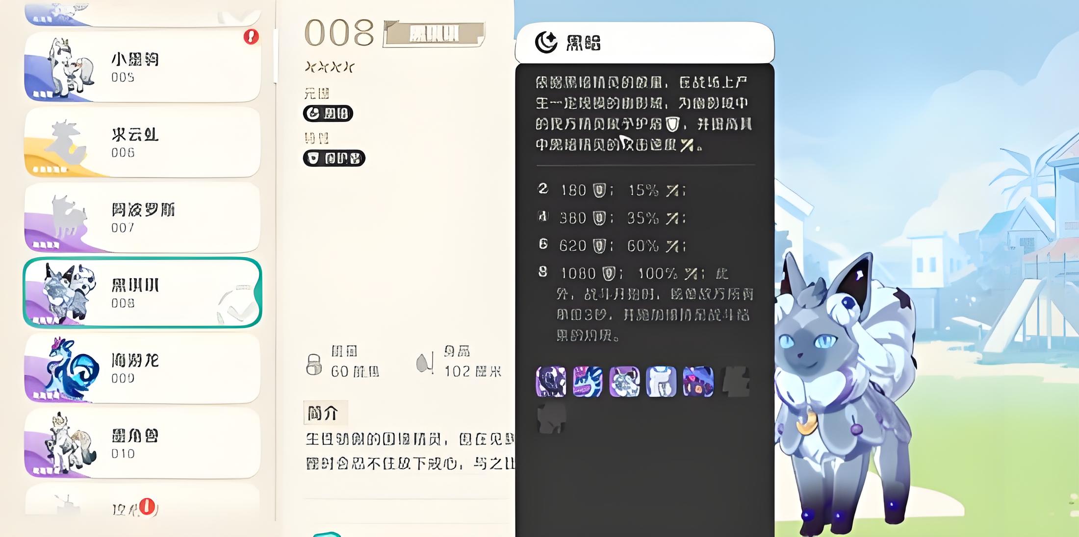 1、形象设计亮眼融合大尾巴狐狸元素配色以蓝紫色与灰色为主,视觉呈现兼具神秘感与高贵气质,黑暗元理归属让角色风格鲜明独特。