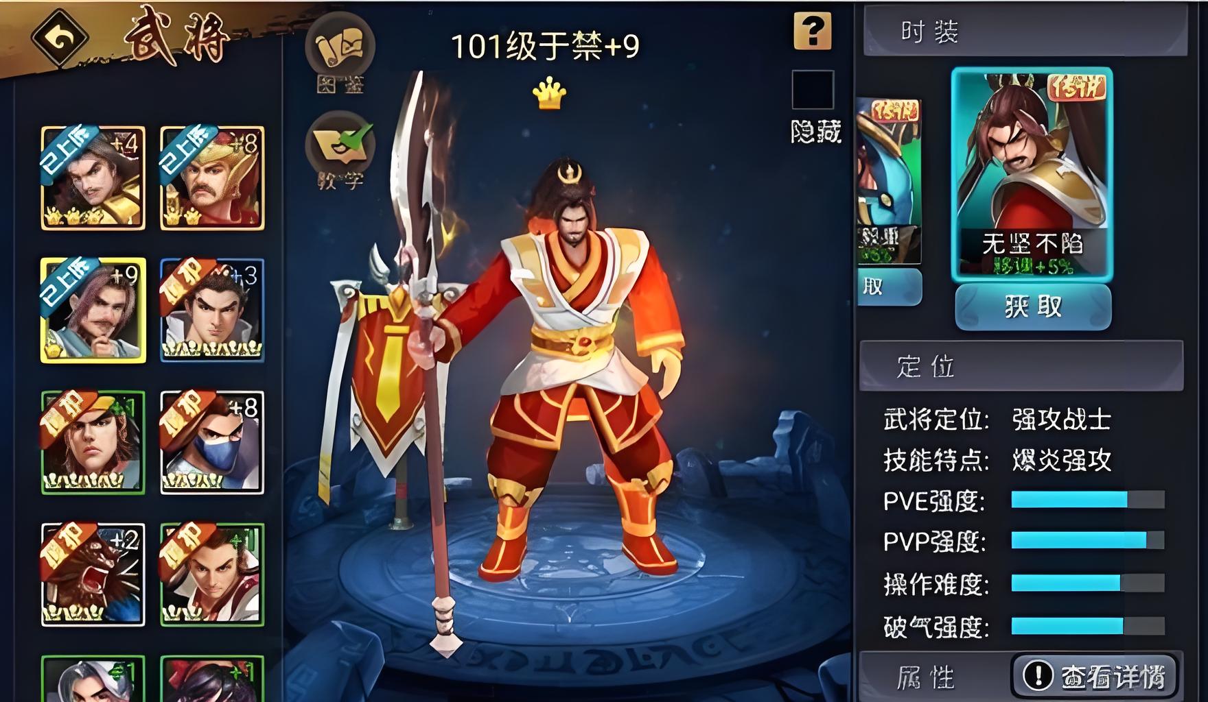 三国乱世霸王中于禁是极具战略价值的武将,其防御能力和团队辅助效果在中后期战斗中不可或缺。作为魏国前排核心,他的获取途径相对明确,技能机制贴合防御体系构建,搭配合理可大幅提升阵容抗压性。本文将详细说明于禁的获取方式、属性特点、技能优势、阵容适配及培养要点。
