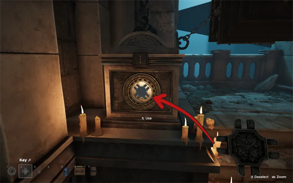 使用钥匙打开右侧混凝土固定装置上的面板,该固定装置将其中一条链条固定到悬挂的棺材上。