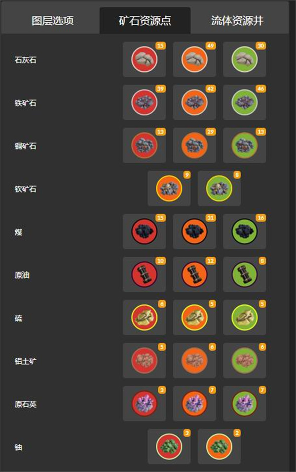 这里有游戏当中所有的资源矿物,点击就可以显示矿物资源的具体点位进行选择使用。