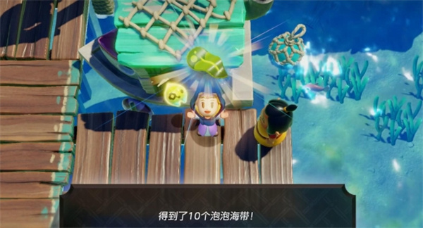 4、用跳床跳上去,然后把烤鱼给他后原路返回去找任务NPC即可完成挑战并获得10个泡泡海带。