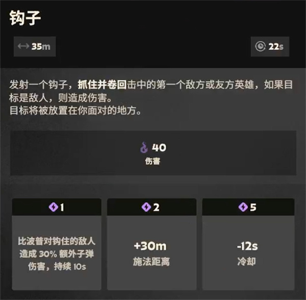 输出类英雄,核心技能是钩索,能开发出很多玩法。