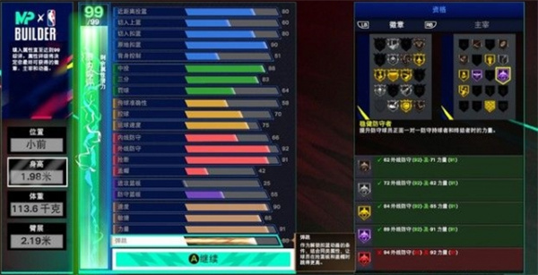 小前锋的属性会相对极端一些,身材方面尽量卡死绿区的中投和三分徽章。