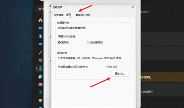 3、「高级」栏中点击虚拟内存框内的“更改”选项,去掉「自动管理」的勾,选择自己游戏的安装盘。