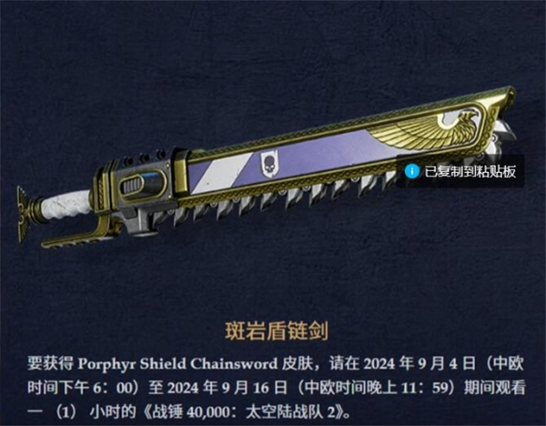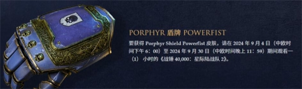 要获得皮肤,请在2024年9月4日(中欧时间下午6: 00)至2024年9月16日(中欧时间晚上11: 59)期间观看1小时的《星际战士2》。