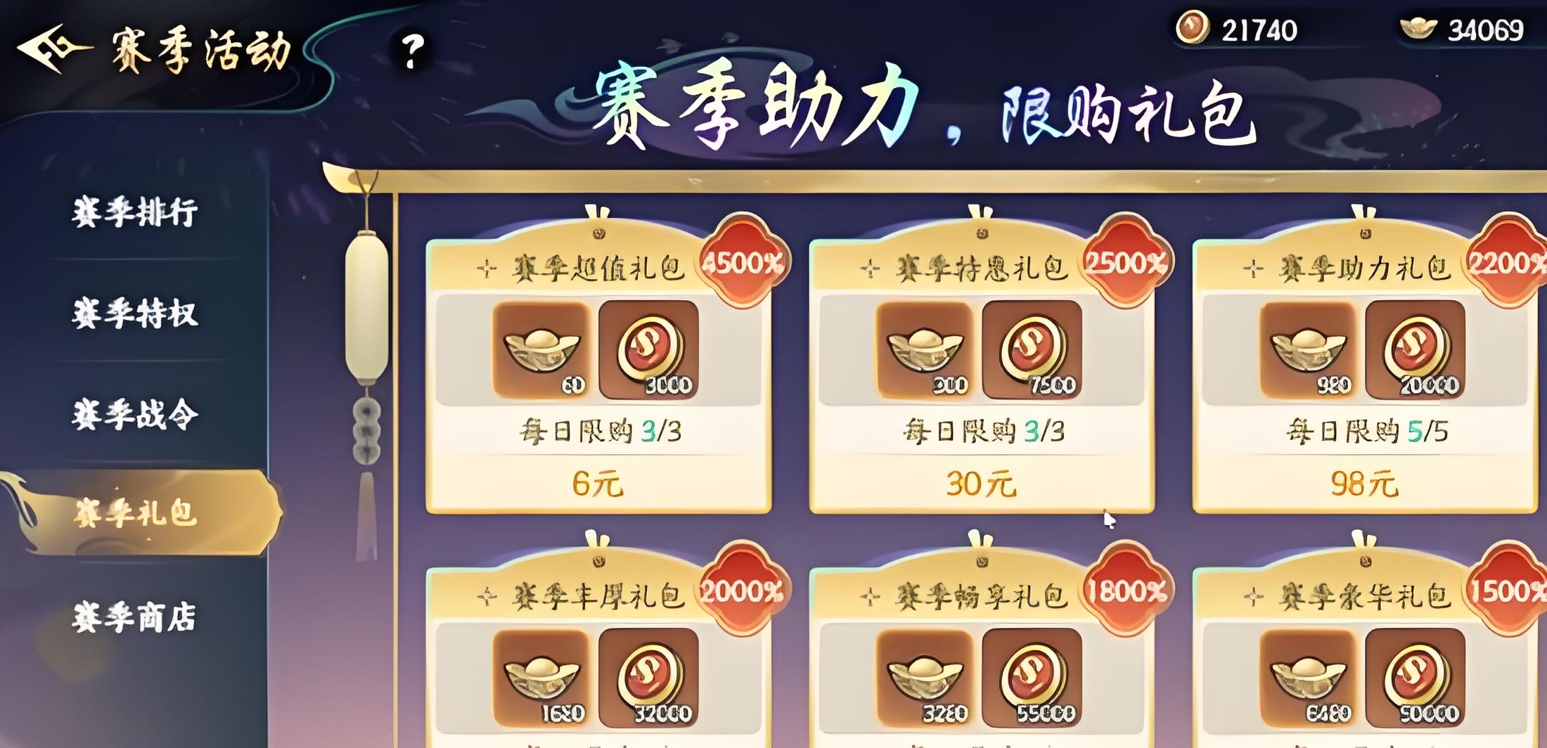 3、6块等小额赛季礼包性价比可观,单次碎片数量有限,但附带头像框战力加成和满级循环奖励机制。